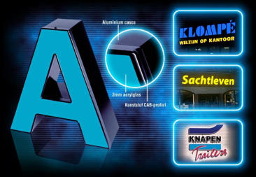 Aluminium doosletters met Led verlichting naar voor of achter verlicht. Lichtbakken aluminium enkel- of dubbelzijdig.